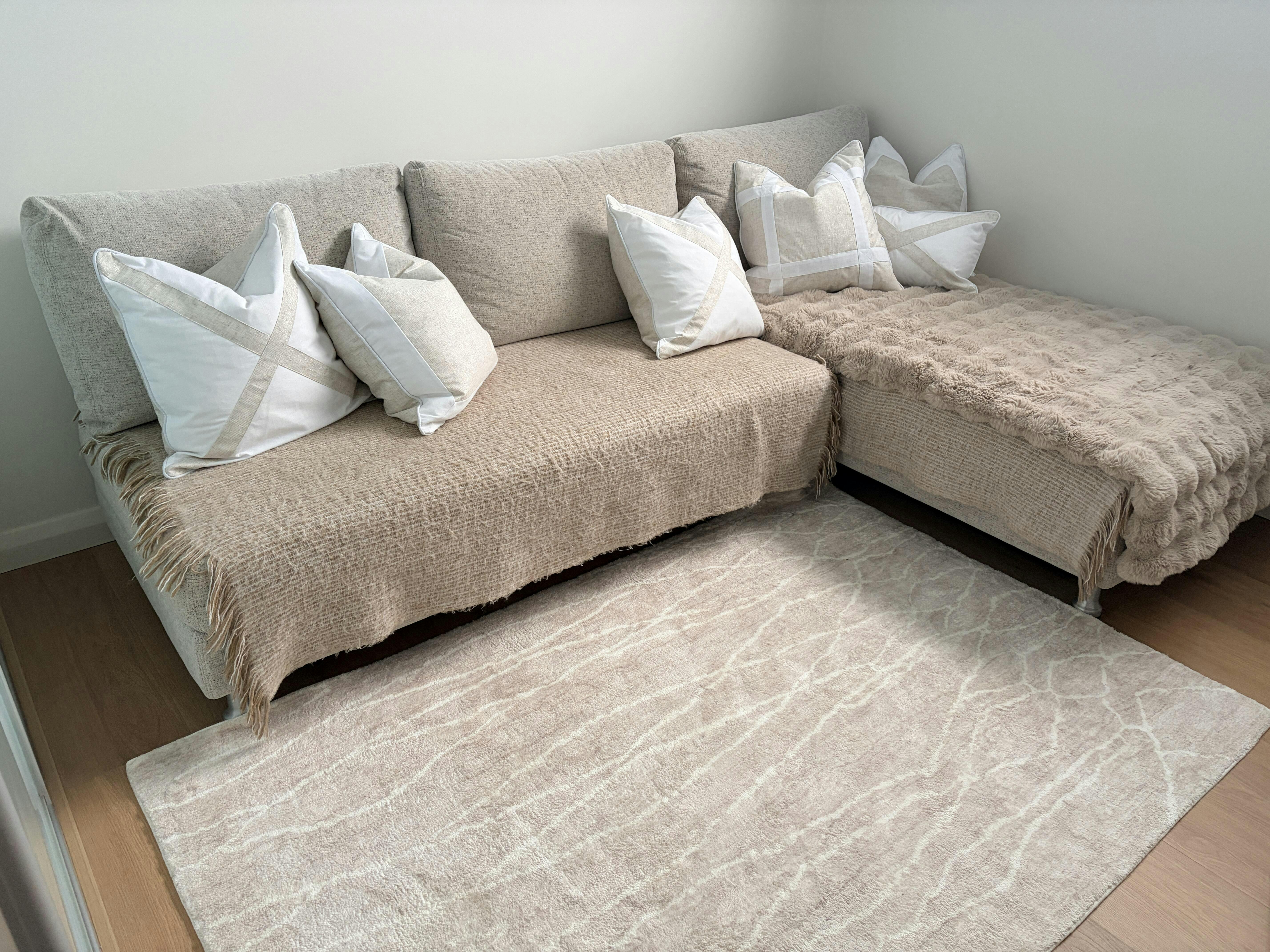 Drawing focus to the center block of lovely, jute-colored polylinen with silver threads, a thick border of white linen imparts a spartan, structural aesthetic that connotes contemporary minimalism.