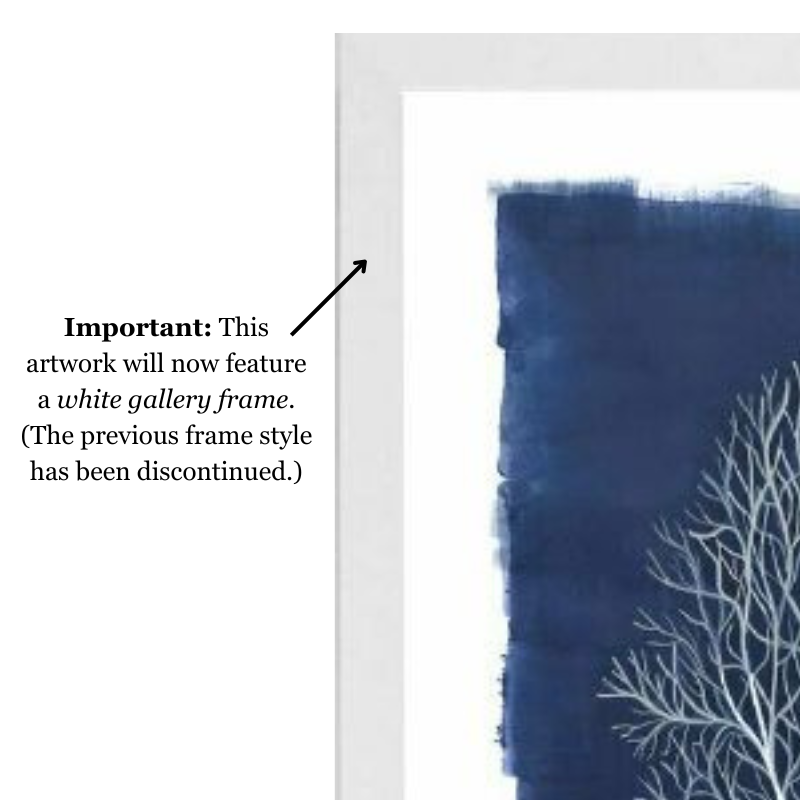 ** Due to supplier changes, the white timber frame will now be replaced with a white gallery frame, similar to the Deep Blue Sea Corals series. We are currently working on updating the imagery and will include a photo of the new frame in the product listing for reference. We apologise for the inconvenience.